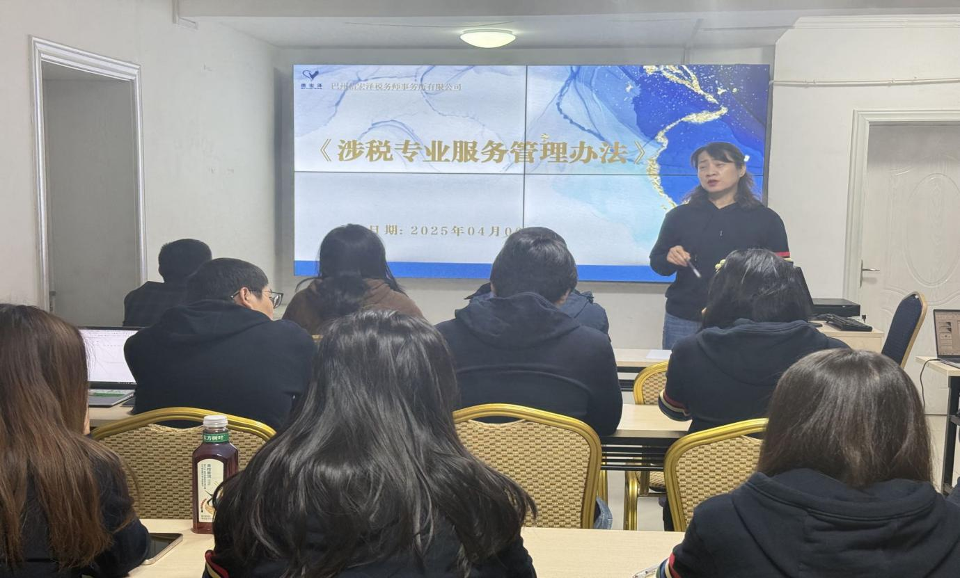 ——巴州信宏澤稅務師事務所全面開展《涉稅專業服務管理辦法(試行)》 專題學習 2025年3月17日,《涉稅專業服務管理辦法(試行)》正式發布,標志著我國涉稅專業服務行業邁入規范化、法治化、高質量發展的新階段。在稅務合規經營的道路上,巴州信宏澤稅務師事務所有限公司,作為深耕稅務服務領域近20年的專業機構,思想高度重視,始終走在依法執業、誠信從業的前列。近日,他們積極響應中稅協發【2025】6號“《關于學習貫徹《涉稅專業服務管理辦法(試行)》”的通知,2025年4月6日組織全體員工深入學習《涉稅專業服務管理辦法(試行)》,深刻領會政策精神,并以此為契機,進一步強化合規意識、提升服務質效,爭做稅務合規經營的“擁護者”和“踐行者”。